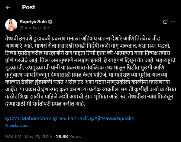 She also urged CM Eknath Shinde and Deputy CM Ajit Pawar to intervene personally and ensure justice.