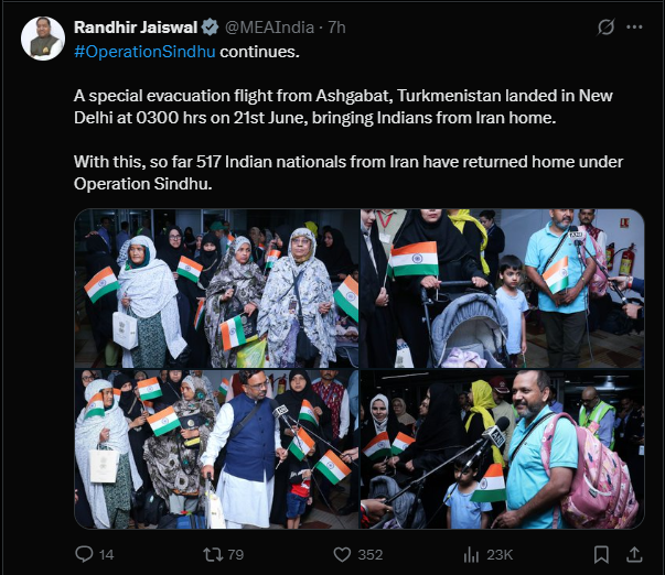 “Operation Sindhu continues. A special evacuation flight from Ashgabat, Turkmenistan, landed in New Delhi at 0300 hrs on 21st June, bringing Indians from Iran home. With this, so far 517 Indian nationals from Iran have returned home under Operation Sindhu.”