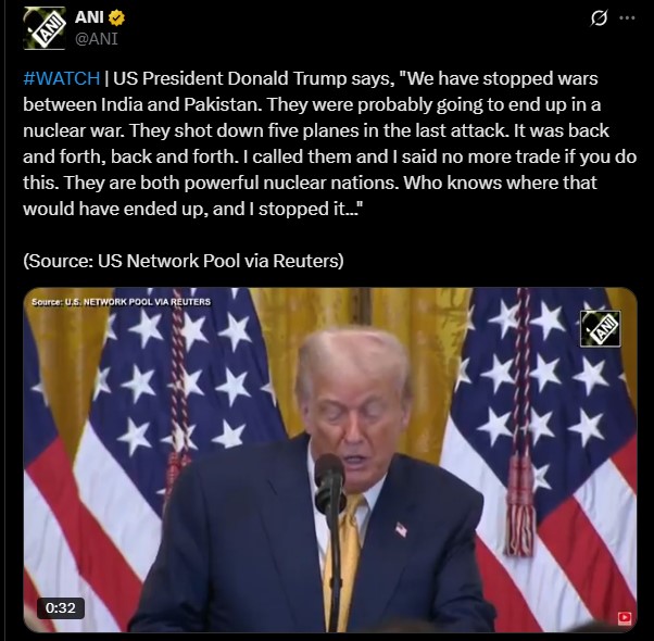 “They were probably going to end up in a nuclear war… They shot down five planes… I called them and said no more trade if you do this. Who knows where that would have ended up—and I stopped it.”(Source: ANI / US Network Pool via Reuters)