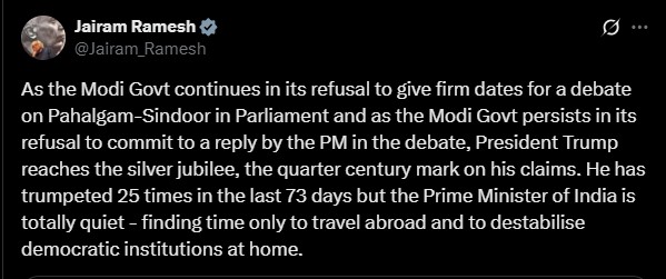 Congress MP Jairam Ramesh also weighed in, criticising the Modi government for not scheduling a proper debate in Parliament on Pahalgam–Sindoor and for not having the PM respond directly to Trump’s remarks.