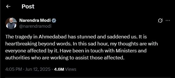 “The tragedy in Ahmedabad has stunned and saddened us. It is heartbreaking beyond words,” Modi posted on X.