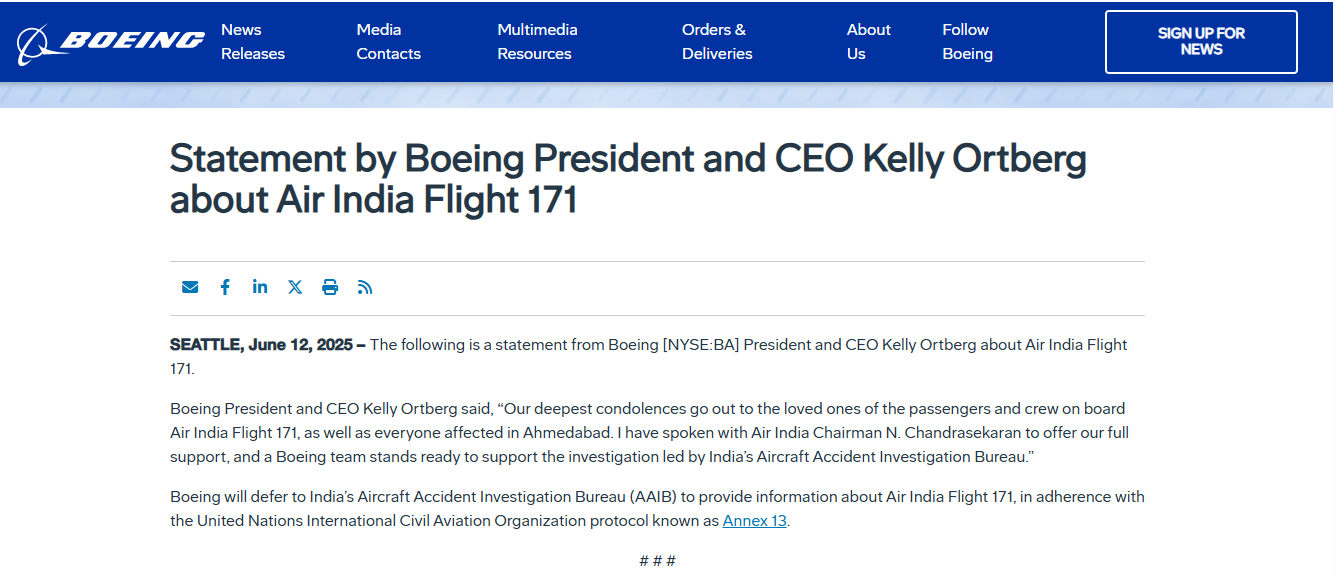 Official Statement from Boeing On Air India Flight AI-171 near Ahmedabad