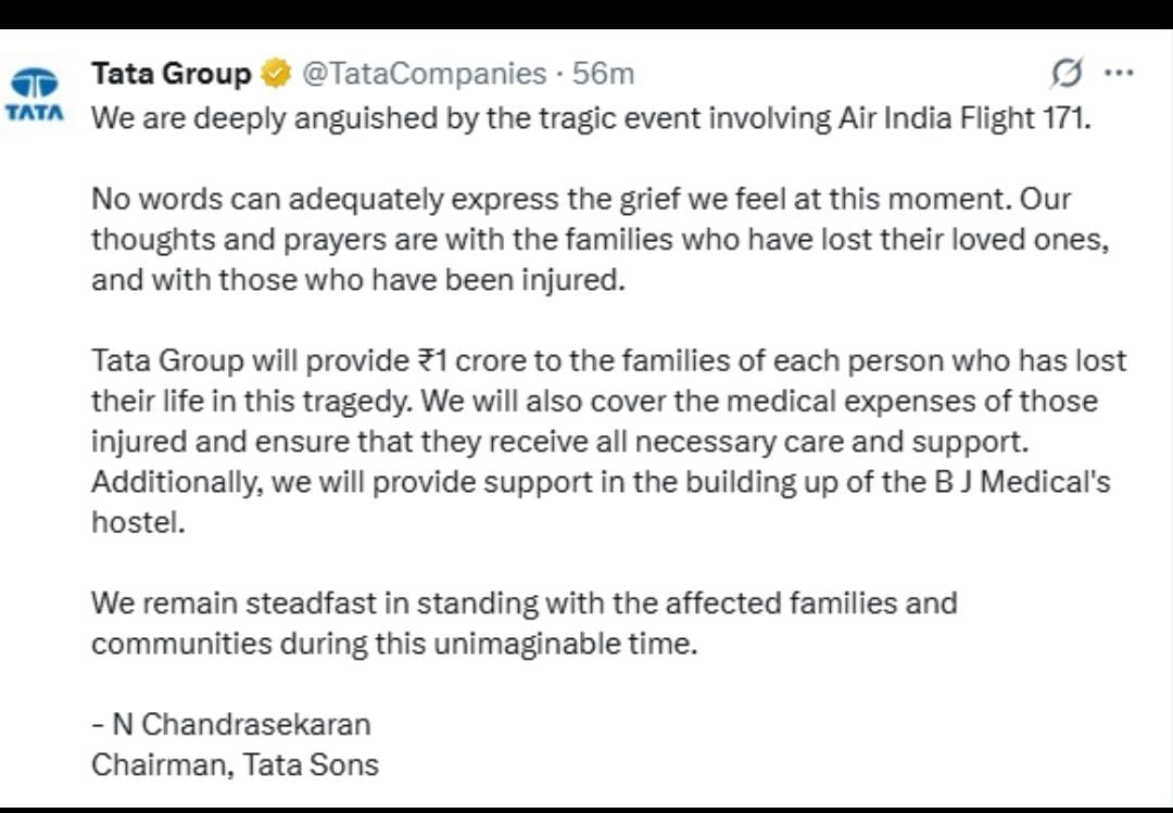Responding to the tragedy, Tata Group Chairman N. Chandrasekaran announced that the families of all deceased passengers and crew members would receive ₹1 crore (10 million INR) each.