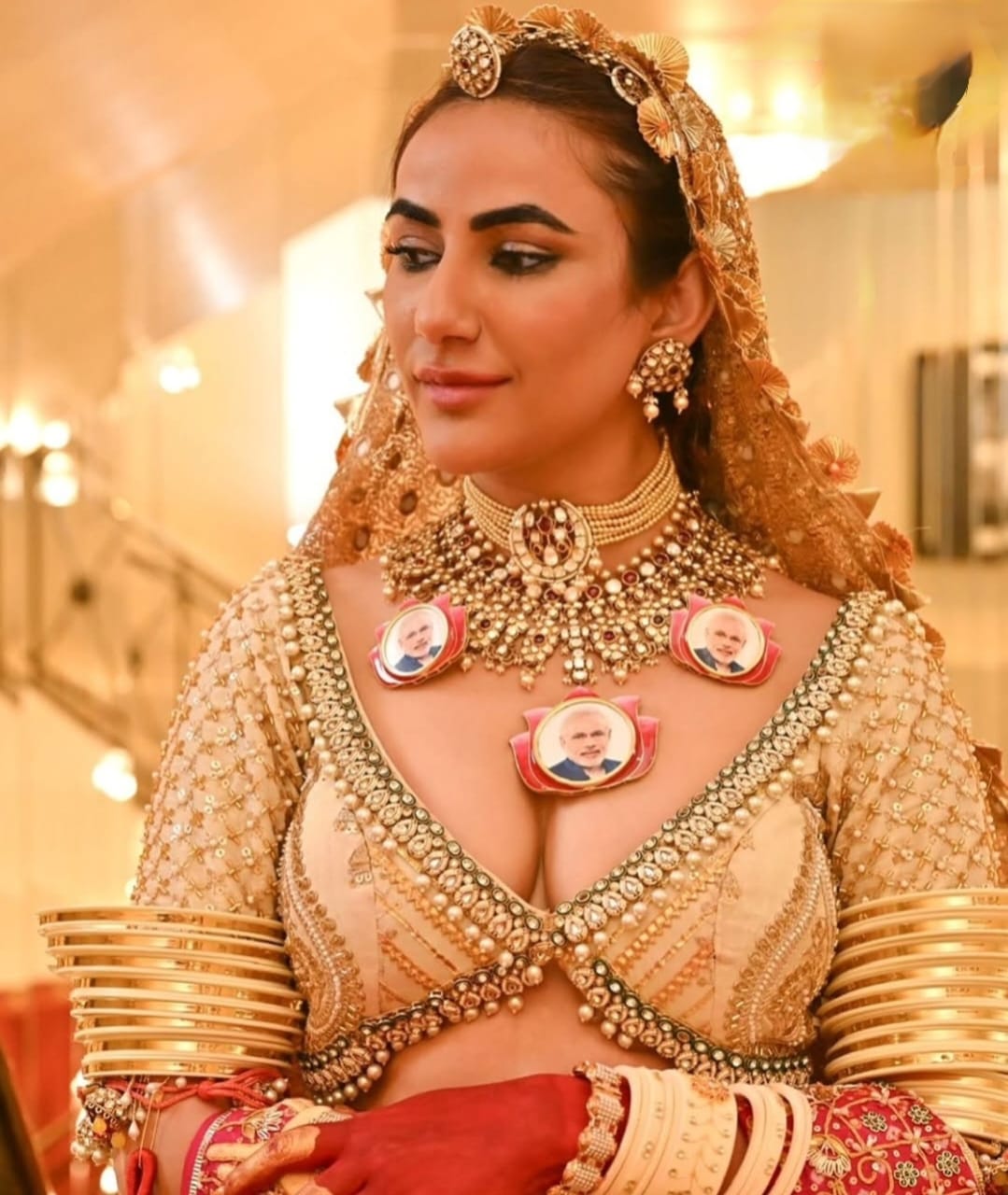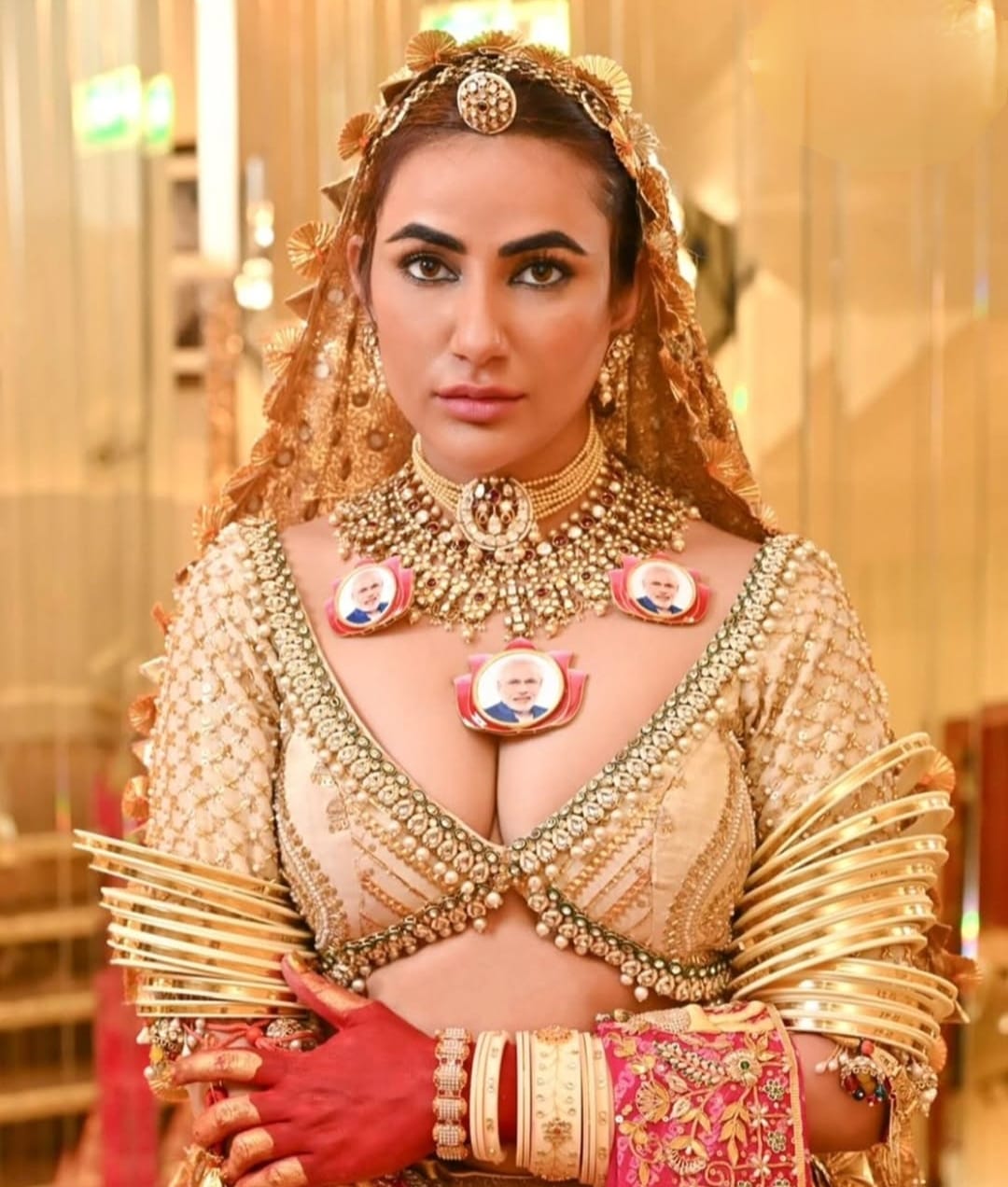 Draped in a deep gold lehenga by designer Roopa Sharmaa, Gujjar paid homage to her Rajasthani roots. The outfit was lavishly adorned with Gota Patti, mirror work, and intricate hand embroidery. She completed the look with a handcrafted Bandhani dupatta from the atelier of Zaribari, designed by Ram, featuring delicate Zardozi detailing.