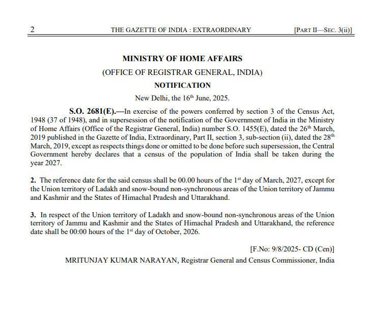 The Government of India has officially issued a notification to conduct the Census of India 2027, marking the country’s 16th national Census and the eighth since independence. The notification, released by the Ministry of Home Affairs on June 16, 2025, outlines timelines, processes, and coverage for the massive national data collection effort.