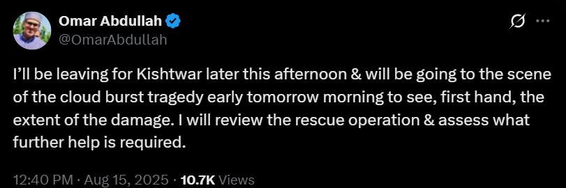 “I’ll be leaving for Kishtwar later this afternoon and will be going to the scene of the cloudburst tragedy early tomorrow morning to see, first hand, the extent of damage. I will review the rescue operation & assess what further help is required,” the CM’s office posted on X.