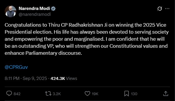 Prime Minister Narendra Modi congratulated Thiru CP Radhakrishnan,” framing him as a leader “devoted to serving society and empowering the poor and marginalised.”