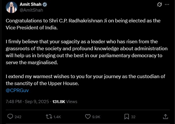 Union Home Minister Amit Shah went a step further: he called Radhakrishnan a man of “grassroots sagacity” who will bring out the best in parliamentary democracy.