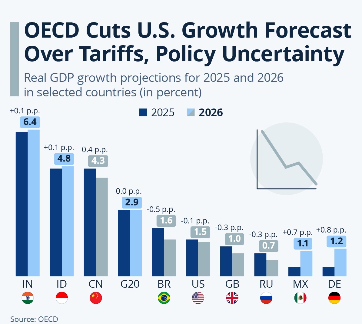 While many countries are slowing down, India continues to stand out. The OECD expects India to grow by 6.3% in 2025 and 6.4% in 2026 — the highest among major economies.