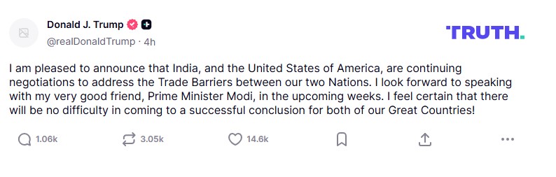 He added that he looked forward to speaking with Prime Minister Narendra Modi “in the upcoming weeks,” expressing confidence that “there will be no difficulty in coming to a successful conclusion for both of our great countries.”