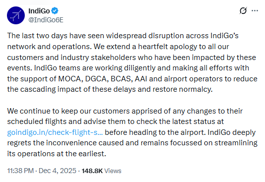 Late Thursday night, IndiGo issued an official apology on X (formerly Twitter), acknowledging the unprecedented disruptions: