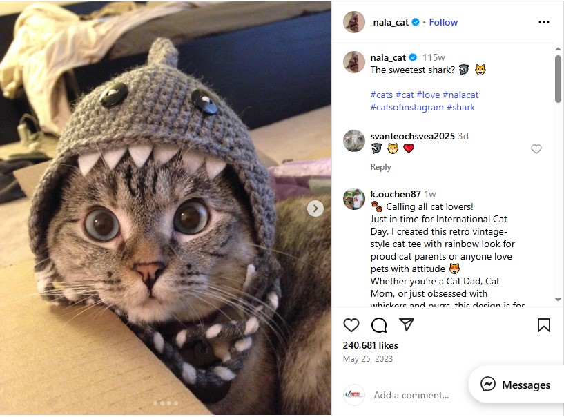 Adopted from a shelter in 2012, Nala’s cross-eyed charm set her apart instantly. She now holds the Guinness World Record as the most-followed cat on Instagram, with 4.4 million followers.