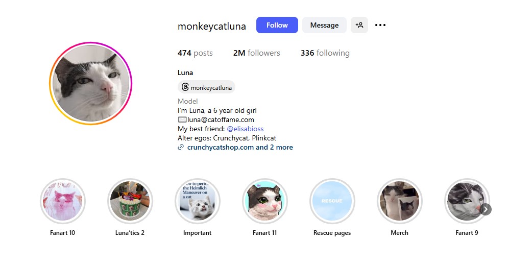 Luna shot to fame after a video of her loudly crunching kibble went viral. With 2 million Instagram followers and some videos reaching 30 million views, Luna blends cute-pet appeal with oddly satisfying ASMR vibes. No gimmicks, just loud snacks, good lighting, and feline confidence.