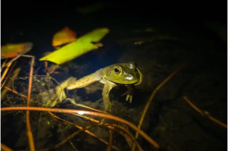 The American bullfrog is native to the eastern United States but was introduced in the West. Voracious eaters with large mouths, their diets can include birds, bats, rodents, newts, snakes, and turtles. (National Park Service). Credit: National Park Service, physics.org