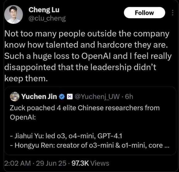Meanwhile, OpenAI engineer Cheng Lu shared his feelings online (before deleting the post):