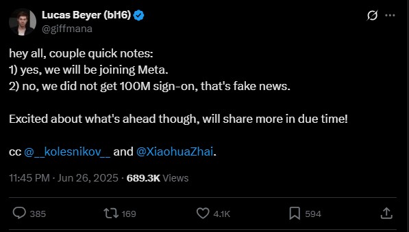Lucas Beyer, one of the researchers who joined Meta, denied the rumor that he got a $100 million signing bonus. On X (formerly Twitter), he wrote: