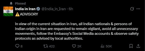 “Advisory posted by the Indian Embassy in Iran on X, June 13, 2025”)