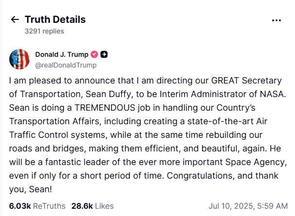 On July 10, 2025, U.S. President Donald Trump confirmed via Truth Social that Sean Duffy, the Secretary of Transportation, will serve as the Interim NASA Administrator. Trump praised Duffy’s leadership in modernizing transportation infrastructure and said he would be a “fantastic leader of the ever more important Space Agency, even if only for a short period.”
