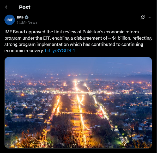“IMF Board approved the first review of Pakistan’s economic reform program under the EFF, enabling a disbursement of ~ $1 billion, reflecting strong programme implementation which has contributed to continuing economic recovery.”