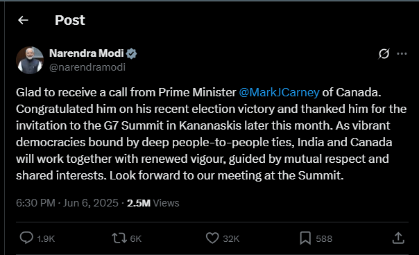 “Glad to receive a call from Prime Minister @MarkJCarney of Canada. Congratulated him on his election victory and thanked him for the invitation to the G7 Summit in Kananaskis later this month. India and Canada will work together with renewed vigour, guided by mutual respect and shared interests. Look forward to our meeting at the Summit,” PM Modi wrote.