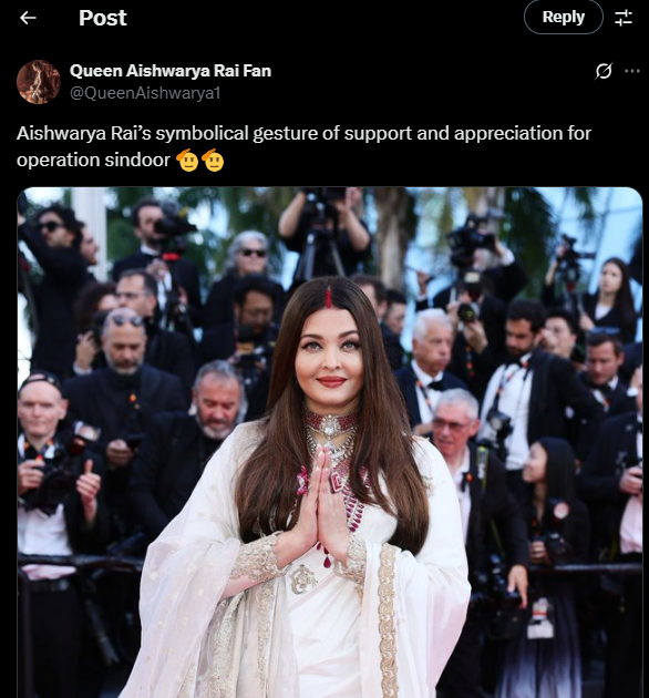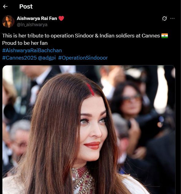 Beyond fashion, many social media users believe Aishwarya’s look carries patriotic symbolism, particularly in the wake of Operation Sindoor — a recent military operation launched by the Indian Armed Forces after the tragic terrorist attack in Pahalgam.