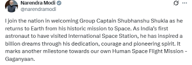“I join the nation in welcoming Group Captain Shubhanshu Shukla as he returns to Earth from his historic mission to Space. As India’s first astronaut to have visited International Space Station, he has inspired a billion dreams through his dedication, courage and pioneering spirit. It marks another milestone towards our own Human Space Flight Mission – Gaganyaan.”
