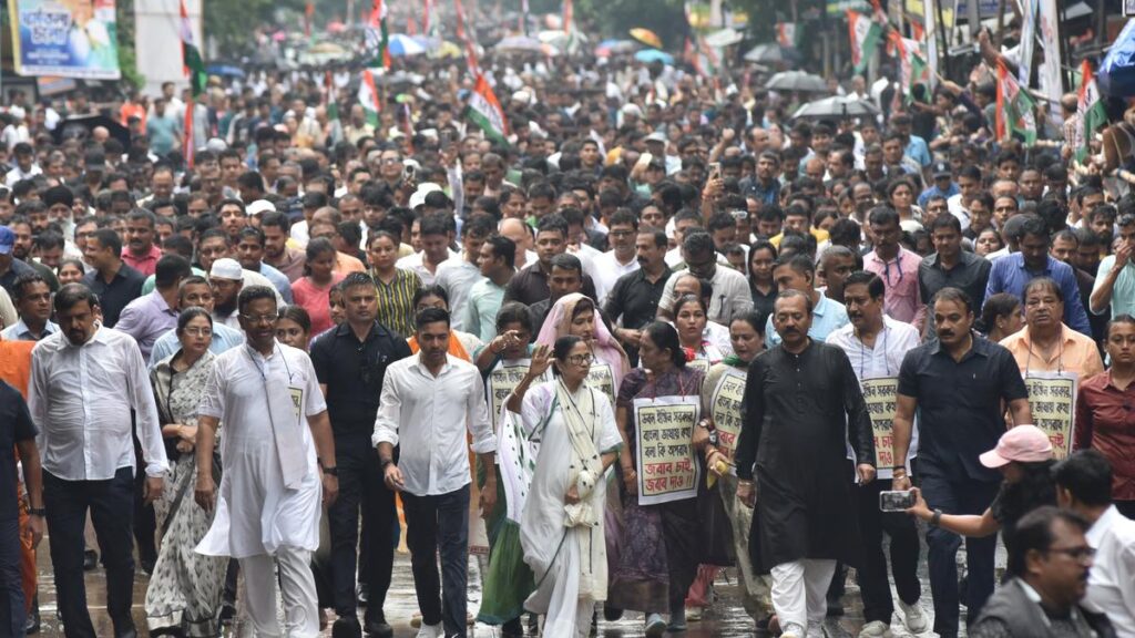 West Bengal Chief Minister and Trinamool Congress (TMC) chairperson Mamata Banerjee on Wednesday led a large protest march in Kolkata, raising strong objections to the alleged targeting and detention of Bengali migrant workers in BJP-ruled states. Addressing the crowd after leading a three-kilometre procession from College Street to Esplanade, Banerjee warned that if attacks on […]