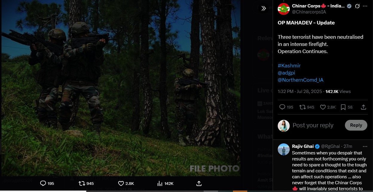 The Army’s Chinar Corps confirmed the success of the ongoing ‘Operation Mahadev’, saying,