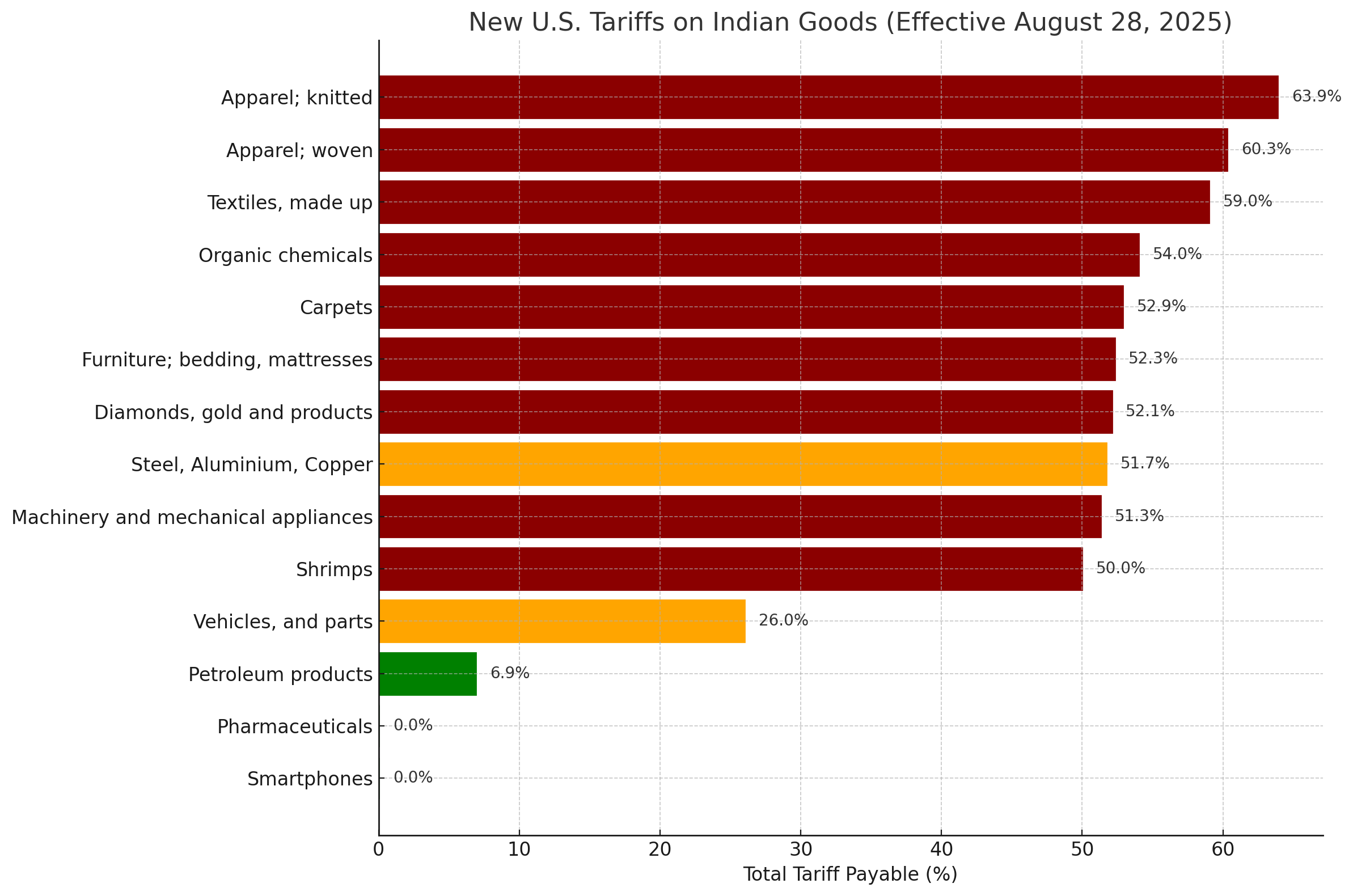 Here is the sector-wise bar chart showing the new total U.S. tariffs on Indian goods (effective August 28, 2025). Each bar is color-coded by the impact level on India: