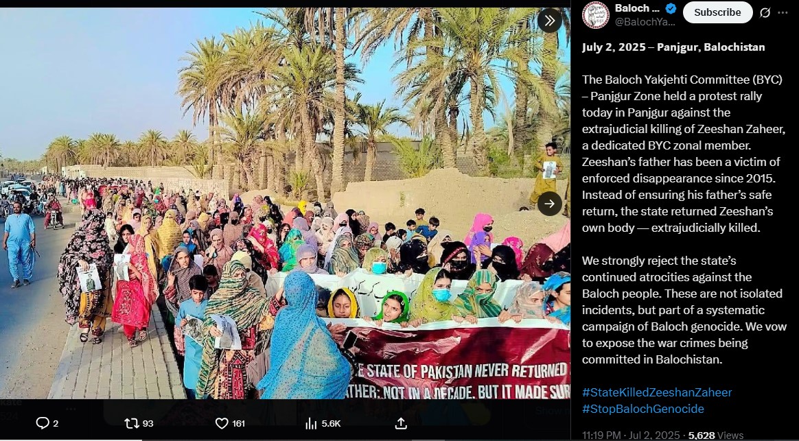 “The Baloch Yakjehti Committee (BYC) – Panjgur Zone held a protest rally today in Panjgur against the extrajudicial killing of Zeeshan Zaheer, a dedicated BYC zonal member. Zeeshan’s father has been a victim of enforced disappearance since 2015. Instead of ensuring his father’s safe return, the state returned Zeeshan’s own body — extrajudicially killed.”