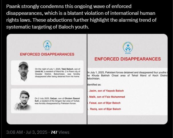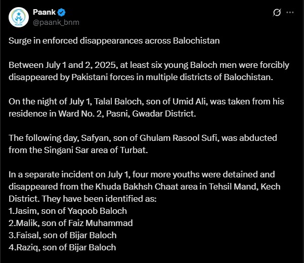 Meanwhile, Paank, the Human Rights Department of the Baloch National Movement (BNM), also raised alarms over a spike in enforced disappearances. In a separate post on X, Paank reported: